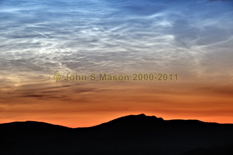 ![]() The phenomenal display of Noctilucent Clouds between 0230 and 0330 on the morning of July 3rd 2011. The image was shot at the top of the Machynlleth-Llanidloes Mountain Road, looking north to the Arans. Product number 071122. Email me to enquire about this image: click HERE. |