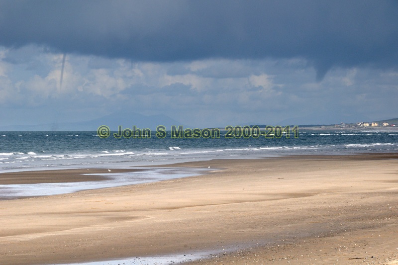 ![]() Waterspout and funnel-cloud, as seen from Ynyslas Beach on the morning of September 4th 2011. These were but two of a whole series of vortices that developed as easterly overnight katabatic flow off the Cambrian mountains, caused by night-time cooling, converged with the SW steering-flow in a weakly unstable environment. Product number 091124. Email me to enquire about this image: click HERE. |