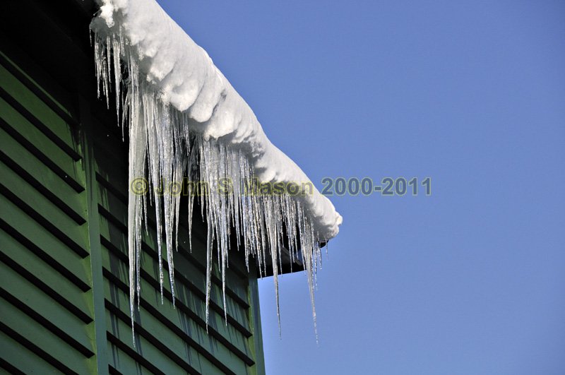 ![]() December 2010 saw a heavy snowfall with slight diurnal thaw following, but by night the meltwater refroze. A few days of this and buildings all around Machynlleth were festooned with alarmingly long icicles, some well over a metre in length. Product number 121045. Email me to enquire about this image: click HERE. |