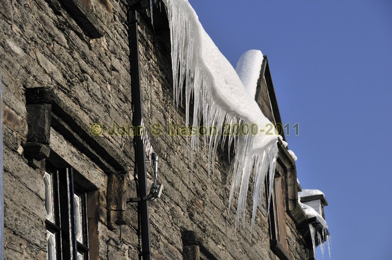![]() December 2010 saw a heavy snowfall with slight diurnal thaw following, but by night the meltwater refroze. A few days of this and buildings all around Machynlleth were festooned with alarmingly long icicles, some well over a metre in length. Product number 121046. Email me to enquire about this image: click HERE. |