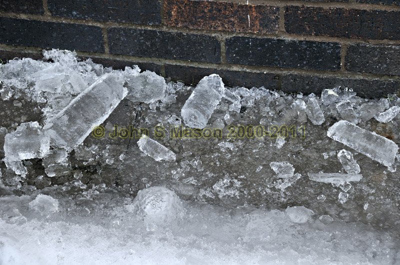 ![]() December 2010 saw a heavy snowfall with slight diurnal thaw following, but by night the meltwater refroze. A few days of this and buildings all around Machynlleth were festooned with alarmingly long icicles, some well over a metre in length. As slightly milder air pushed in, these began to fall..... Product number 121048. Email me to enquire about this image: click HERE. |