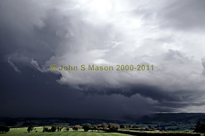 ![]() Gust-front about to be flung from the rear of a severe thunderstorm near Llandinam, Mid-Wales, August 2004. The front travelled south-west (the storm itself was going northwards) at about 40mph as I fled the scene! Product number 2000-2009350. Email me to enquire about this image: click HERE. |