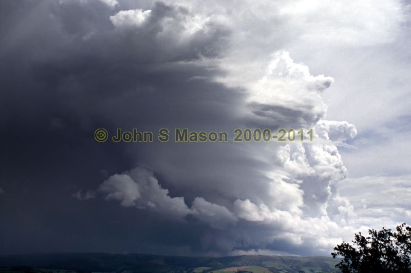 ![]() A persistent, striated updraught-tower over the Cambrian Mountains, and separate from the precipitation that is falling upwind (to its left). The strong signs of rotation suggest that the storm could be a supercell; this storm had already travelled from as far away as Devon (a long way by any standards), supporting the supercell theory. August 2004. Product number 2000-2009354. Email me to enquire about this image: click HERE. |
