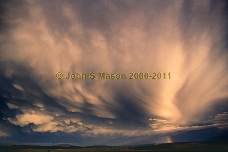 ![]() Mammatus clouds are strange, pouchlike protrusions that can form on the underside of a thunderstorm's anvil-shaped cloud-top. They are caused by cold air sinking downwards and are often a sign of strong storms. This image is part of a sequence I was able to shoot after following a squall-line over the Cambrian Mountains late on a May evening in 2003. As the whole mass receded, this incredibly sheared storm-anvil became apparent. Product number 2000-2009853. Email me to enquire about this image: click HERE. |