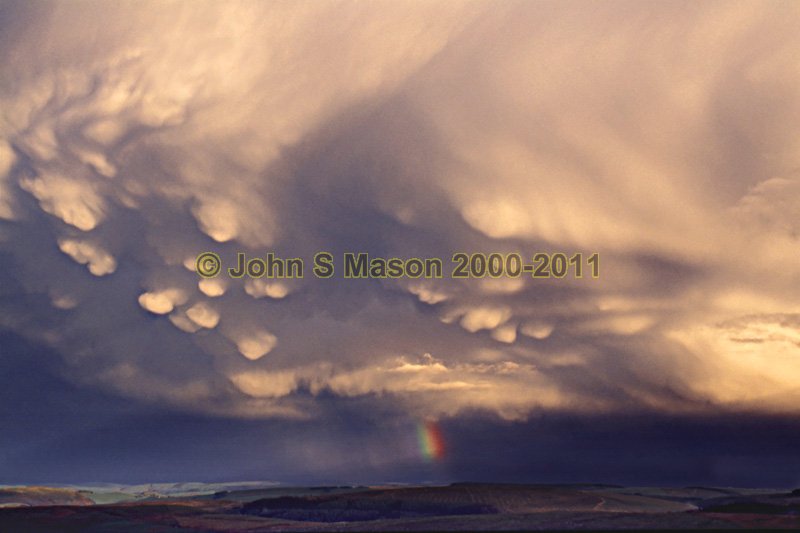 ![]() Mammatus clouds are strange, pouchlike protrusions that can form on the underside of a thunderstorm's anvil-shaped cloud-top. They are caused by cold air sinking downwards and are often a sign of strong storms. This image is part of a sequence I was able to shoot after following a squall-line over the Cambrian Mountains late on a May evening in 2003. As the sun set the light became more and more surreal! Product number 2000-2009856. Email me to enquire about this image: click HERE. |