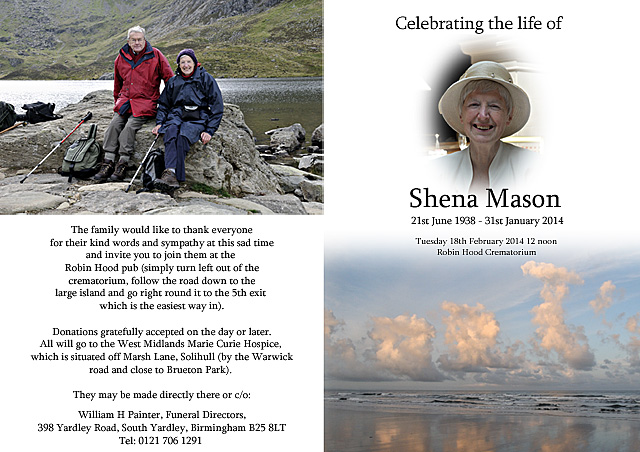 Marie-Curie Hospice in Solihull on January 31st 2014. Grief is of course a perfectly normal part of bereavement, but in this case it has not all arrived in one great chunk, for me at least. Instead it has manifested itself in a series of stepwise shocks. According to the oft-quoted Kübler-Ross model, grief occurs in five steps: denial, anger, bargaining, depression and acceptance. I do not think, in the instance of a long terminal illness, that this is the case. The way that I have dealt with this has been with complete acceptance at each stage, but with accompanying great sadness. The last two stages thereby interweave: denial is dangerous because to deny the obvious is to ill-prepare yourself for the unfolding reality, and you don't bargain with cancer: it is not something with a conscience. Thus there was the initial diagnosis, the possibility of recovery following surgery, the unanswered questions as to the unusual nature of that surgery, the recurrence, the appearance of metastases, the first use of the word 'palliative', the discovery that the surgery was indeed inappropriate, the spread of the metastases, the loss of ability to do those things she loved bit by bit and the final entry into the hospice last December. Wham, bam, slam, again and again and again over the years. Without doubt this has been an incredibly difficult and at times emotionally exhausting period of our lives. But as time goes by, the stark visions of those last weeks in the hospice and watching the inevitable, as the connections that we were all so familiar with one by one disconnected, these have started to fade. In their place comes other memories - the ones that matter far more, of happier times in years past. We never discussed matters of death and its aftermath: it simply wasn't in Mum's nature to contemplate such things. This inevitably left her survivors with the challenge of making up the rest as best we could. I'd like to think that we did a good job, and judging by the reaction of the 120-odd people who attended, it seems that we did, and we take solace in that. And so without further comment, here is the Eulogy I wrote to my mother - a celebration of her life and our memories of that - which I read at her funeral service on February 18th, because several people said they would like a copy and there were others, unable to attend, who we know would like to see what was said: Eulogy Shena Mason – wife to Colin of so many years, mother, facilitator and friend. Because, for us – the next generation - that's how it was. I’ll try to explain. The story of life is one of boundaries. At first, in the fragility of childhood, we are protected from them. Then, along come the teenage years, when we begin to test them for ourselves, discovering them, pushing them, and coming to terms with our own, unique limitations along the way. Finally, with adulthood, there comes long friendship, and we can laugh with each other about them, and the scrapes that we have all encountered, on our respective journeys. And that's how it was in our lives, for which we can be grateful. But over the past nine years, a set of new boundaries, boundaries we hoped we'd never encounter, have challenged us all. I vividly remember the night in 2005 when I heard, over the phone, that something was amiss. “Mum, I said, “between us we'll kick the stuffing out of it” (or words to that effect). And so the fight began: we all of us fought it together through its ups and downs. Indeed, as my mother said, “cancer doesn't just affect the one who has it”. This will be recognised and understood by anybody whose life has been touched by the disease. And so on we fought, until the final months and the endless cross-country train-journeys and the evaporating hopes and the sad inevitability of it all. But even in those difficult weeks, there were moments of light. Christmas 2013 stood out as special for all of us. It was made possible to a great extent by the wonderful staff at the Marie-Curie Hospice in Solihull. Their kindness and support has been awesome and we'd like to forward all donations received today to them in honour of that. Born in 1938, my mother had the good fortune, living as she did in Coventry, to survive everything that the Luftwaffe threw in her direction. She could recall few details from this time, and perhaps that's a good thing. Post-war holidays were spent at Cowes, on the Isle of Wight. This was where her grandparents had moved to in the face of imminent conflict, thinking it would be relatively safe. Ironically, it was their house that got bombed! Moving on, and we fast-forward to the 1950s, when her parents relocated to the Solihull district, finally settling in Knowle, in the house that her father built for them. The passion for natural history and the love of the mountains that he possessed had by then found a new and enthusiastic devotee. This led in turn to a group of like-minded young people going off into the hills at every opportunity – including someone – Colin Mason, who was later to be my father. They were to marry in 1960. The seeds of her professional life - which was centred around writing and journalism - were planted around the same time. The career progressed, with a few interruptions (like Fiona and myself), and led in time to her editorship of what was THE trade-journal in the jewellery sector. In later years, she found new directions, beginning with a life-changing degree-course in Literary and Cultural Studies at the University of Warwick, where she graduated with a 2:1 in the summer of 1998. Following on from that, she was to become deeply involved with a number of important heritage projects in the Birmingham district. To give just two examples out of many: there was the wonderful and award-winning Museum of the Jewellery Quarter, which opened in 1992. Then, there was the restoration of Soho House, one-time residence of the great industrialist, Matthew Boulton. Here, well over two centur